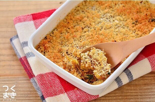 柔らかいので成形がむずかしく、揚げる際も破れて失敗してしまうことが多いカニクリームコロッケも、スコップコロッケにすれば、誰でも失敗知らずで簡単につくることができます。パン粉にオイルを混ぜ合わせてトッピングすることで、オーブンで焼いてもべちゃっとならずサクサクとした食感を楽しめます。