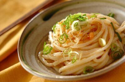 たらこバターが相性バツグンのぶっかけうどんのレシピ。加熱した冷凍うどんが冷めてしまう前に、バターとたらこをのせるのがポイントです。こまかく刻んだねぎを散らして、彩りを添えましょう。