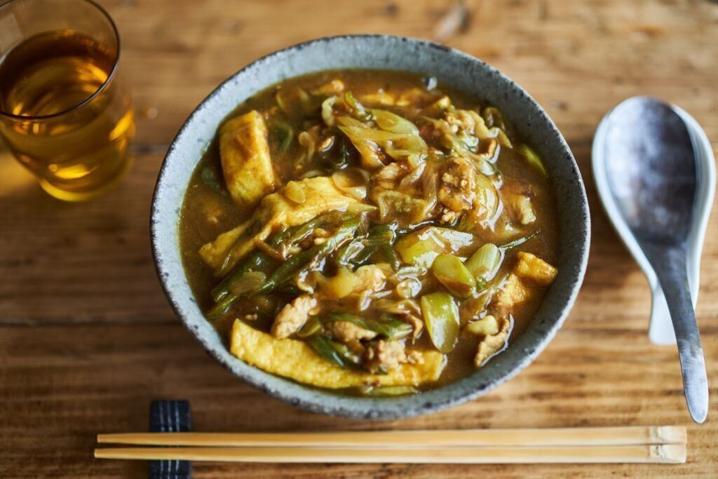 かつお節やカレー粉などを使った、お蕎麦屋さんのような味わいのカレーうどんのレシピ。スパイスの旨味のあるスープで体の内側から温まり、エネルギーが湧いてきそうな一品です。