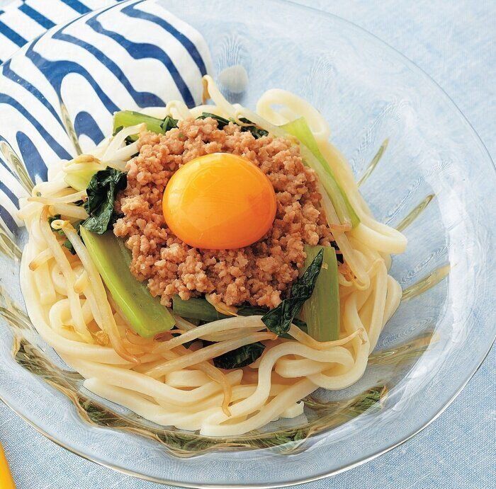 冷凍うどんにナムルと豚そぼろをのせた、冷やしビビンバうどんのレシピです。卵黄が冷たいうどんによく絡みます。ナムルにあえたゴマ油が効いていて、食欲をそそる味わいに。