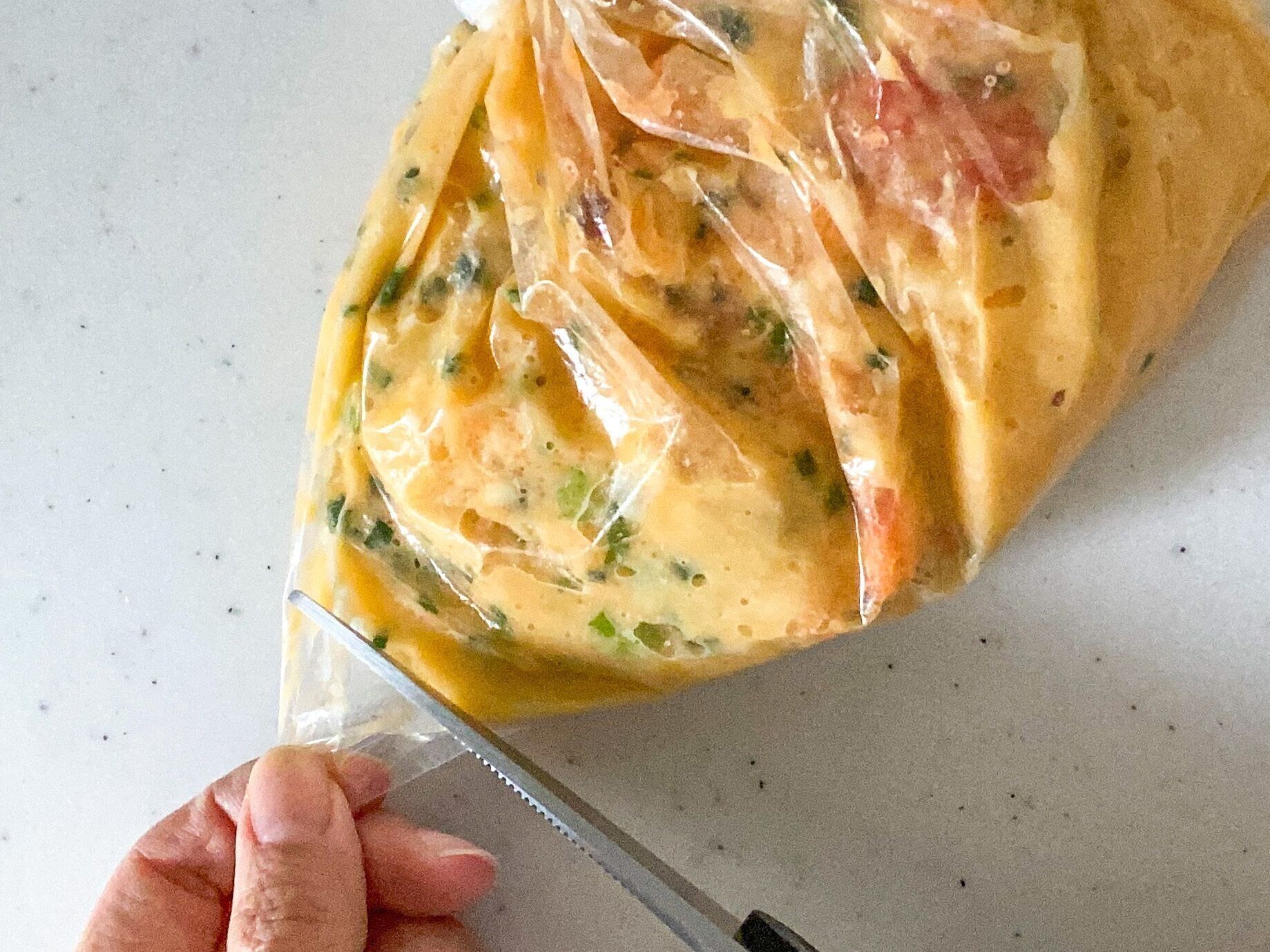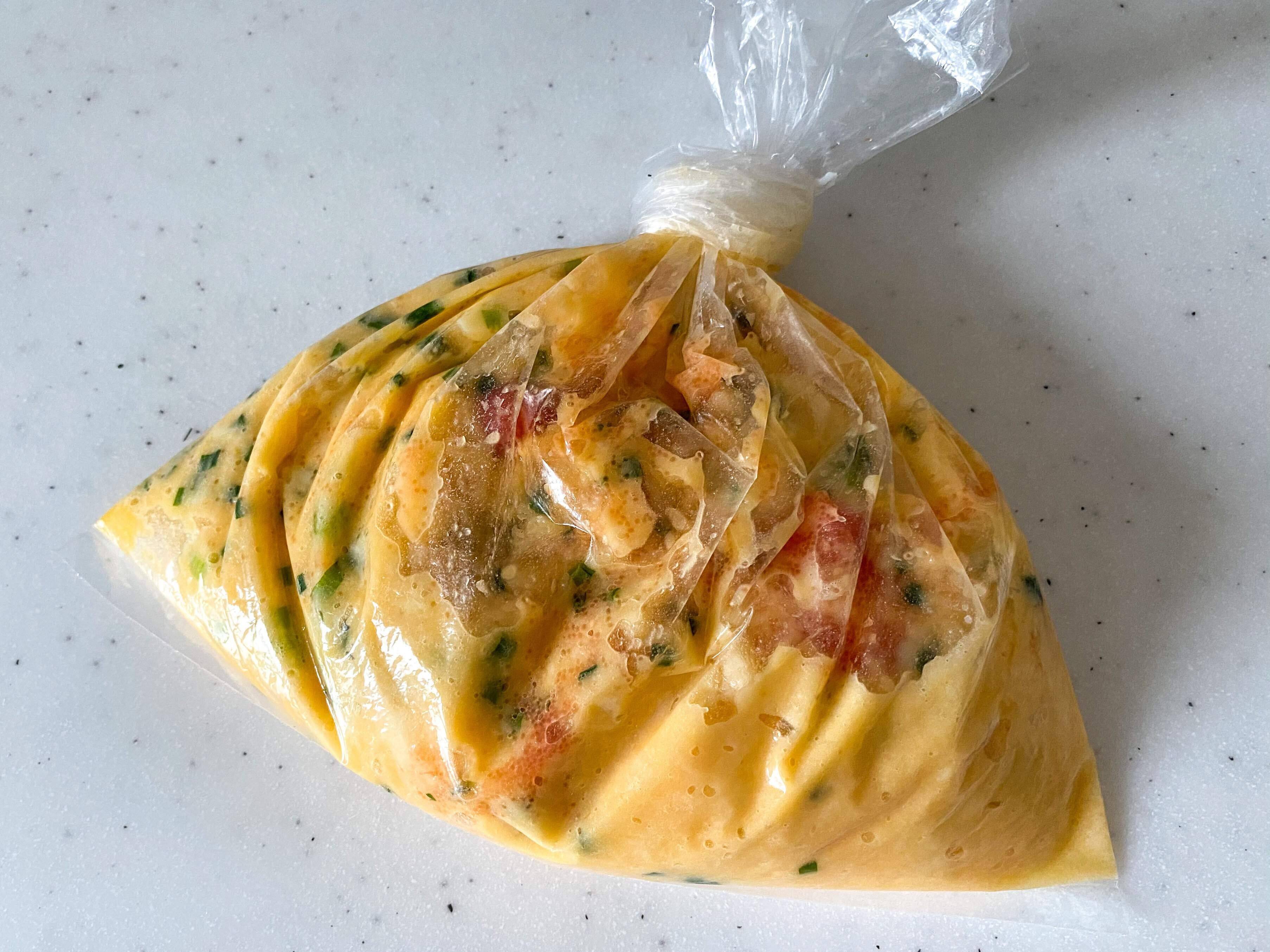 ポイント2:明太子を加えたら軽くもむ程度にし、ところどころに明太子の塊が残るようにしてください。また、1/3量程度を袋に入れずに残しておき、フライパンに流し込んだあとに加えると、焼き上がったときに表面に明太子が見えます。