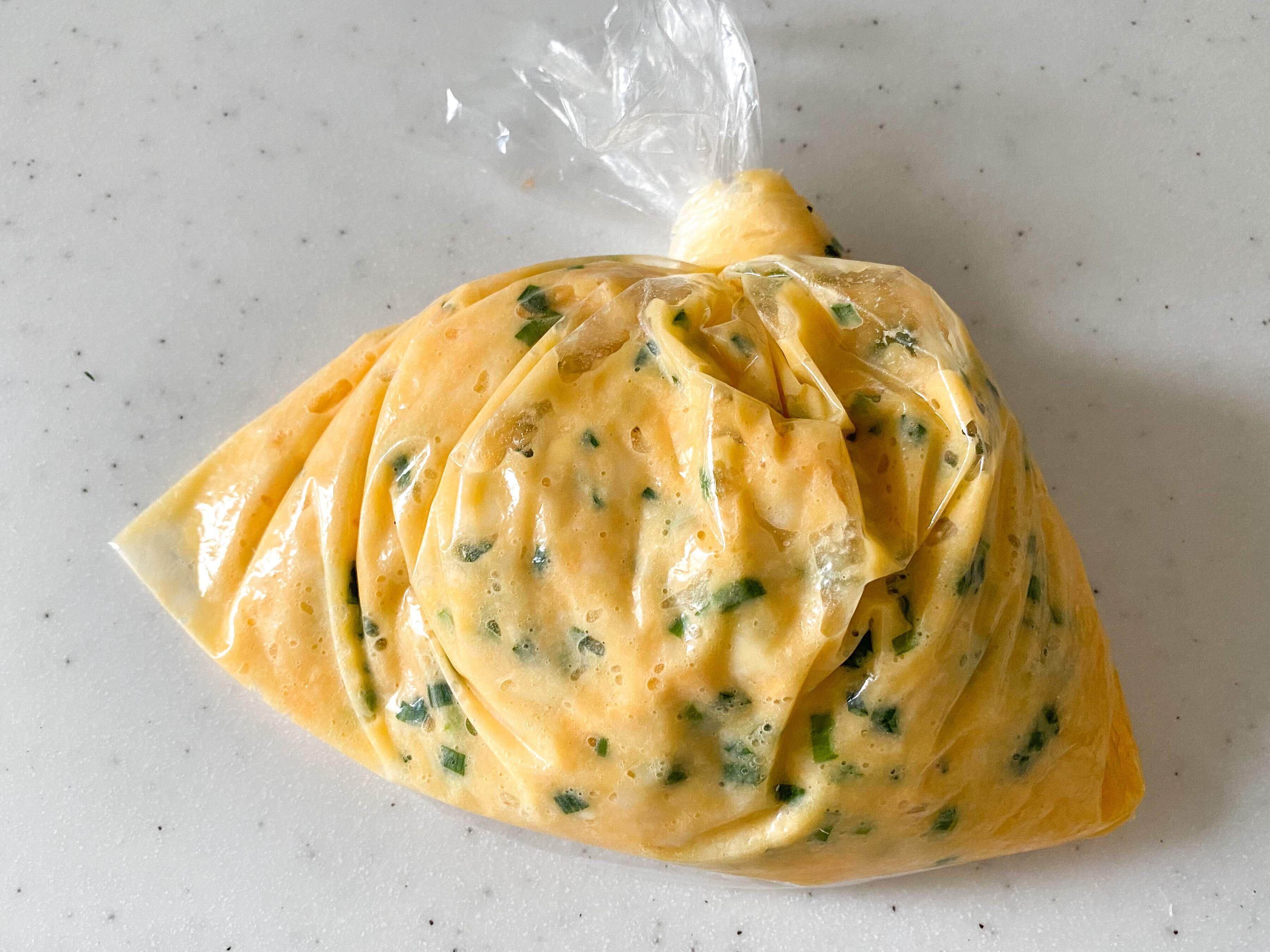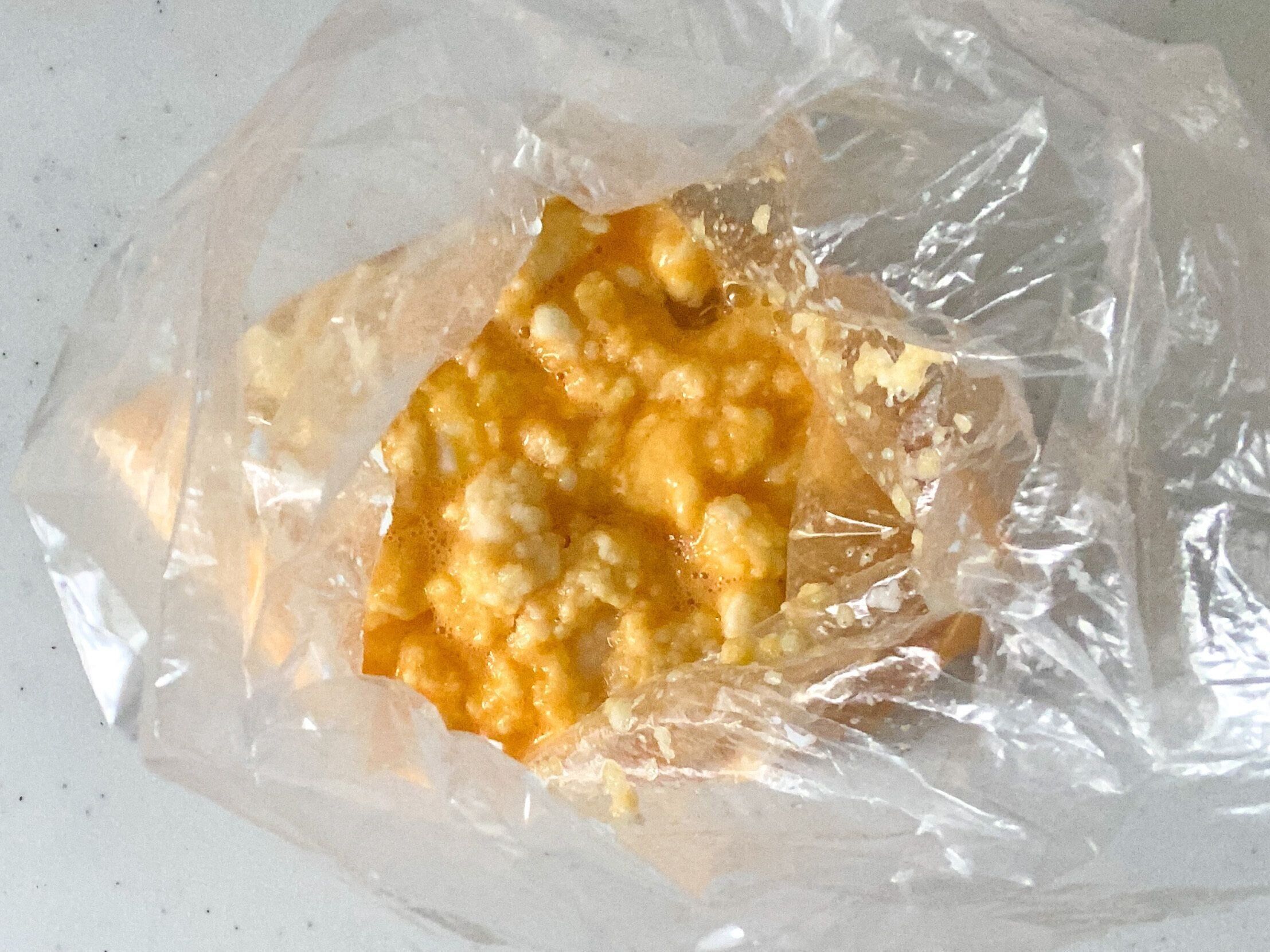 次に卵を入れてはんぺんとなじませ(ここからは袋の口を閉じ、材料入れる時に開ける)、Aを加えてさらに揉んでなじませる。