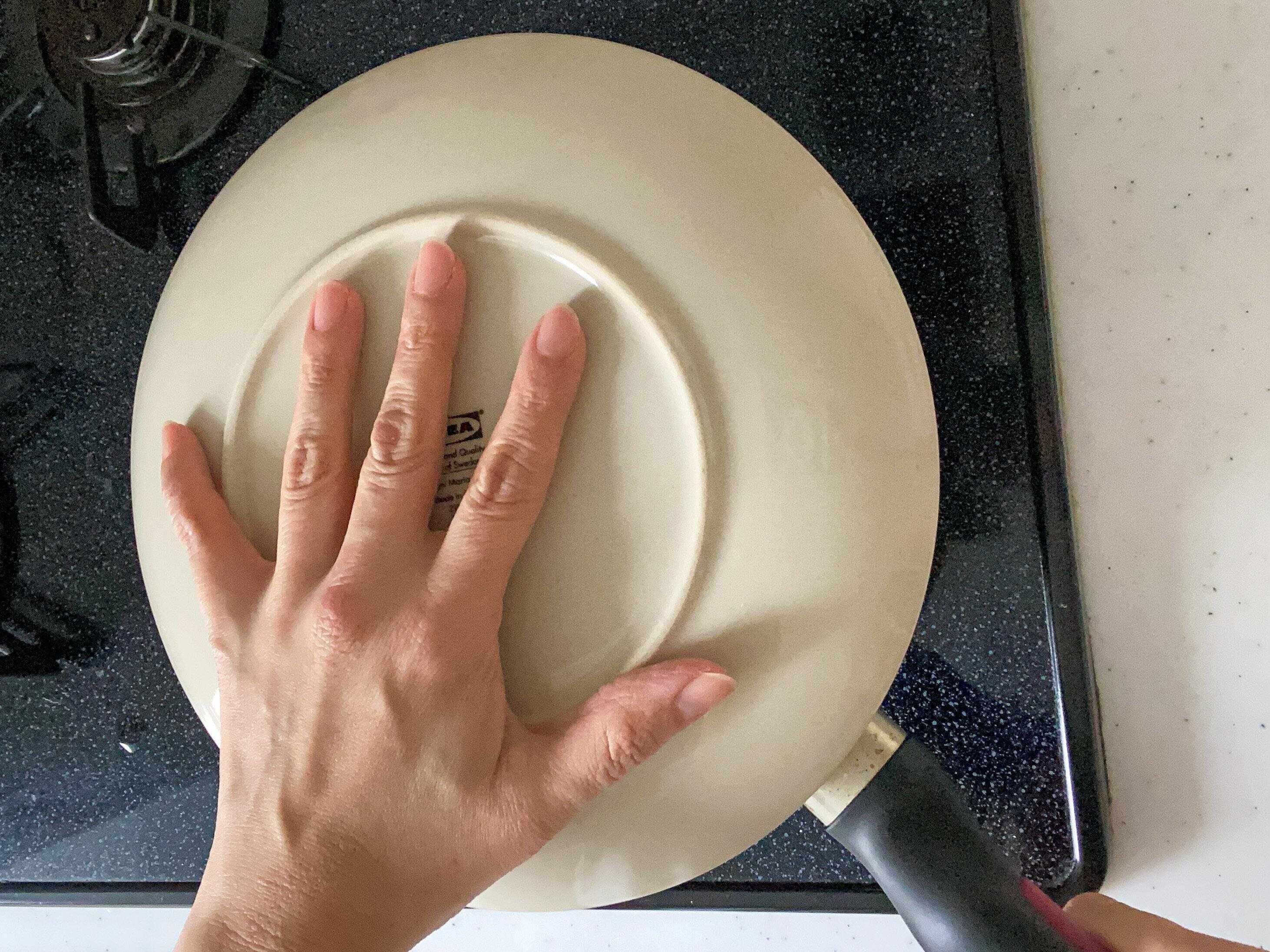 こうすることで、形を保ったまま上下を返すことができます。お皿のサイズは、フライパンより直径3cm以上は大きいものがベストです。
