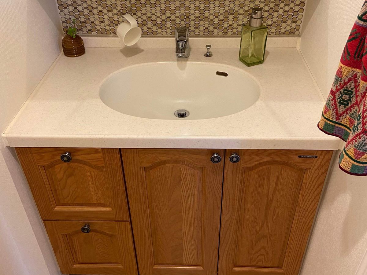 洗面台の上の水滴をスムーズに拭けるように、なるべくスッキリさせています。必要最小限のモノにすることで、掃除しやすい環境をつくっています。