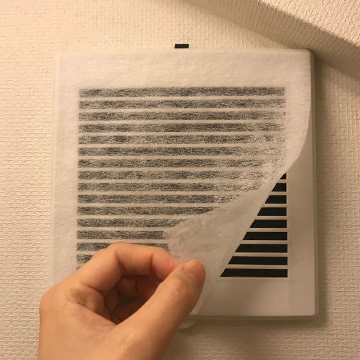 汚れたら剥がして、新しいフィルターを貼るだけです。トイレのフィルターは2、3週間に1度の頻度で交換しています。お金はなかなか貯まらないのにホコリは本当に溜まるのが早い!