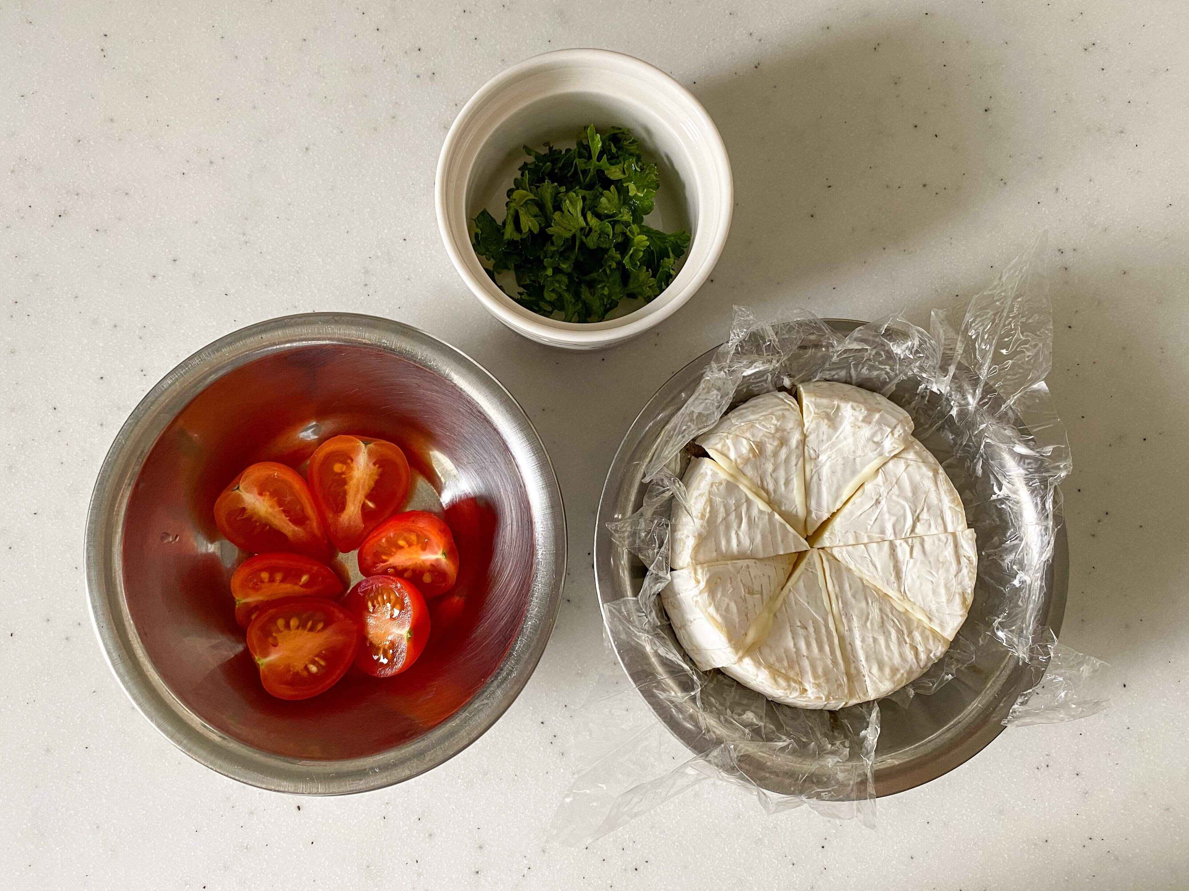 (1)カマンベールチーズは8等分に切る。ミニトマトは半分に、パセリは刻んでおく。ごはんは、冷やご飯や冷凍ご飯を使用する場合は、レンジにかけて温めておく。