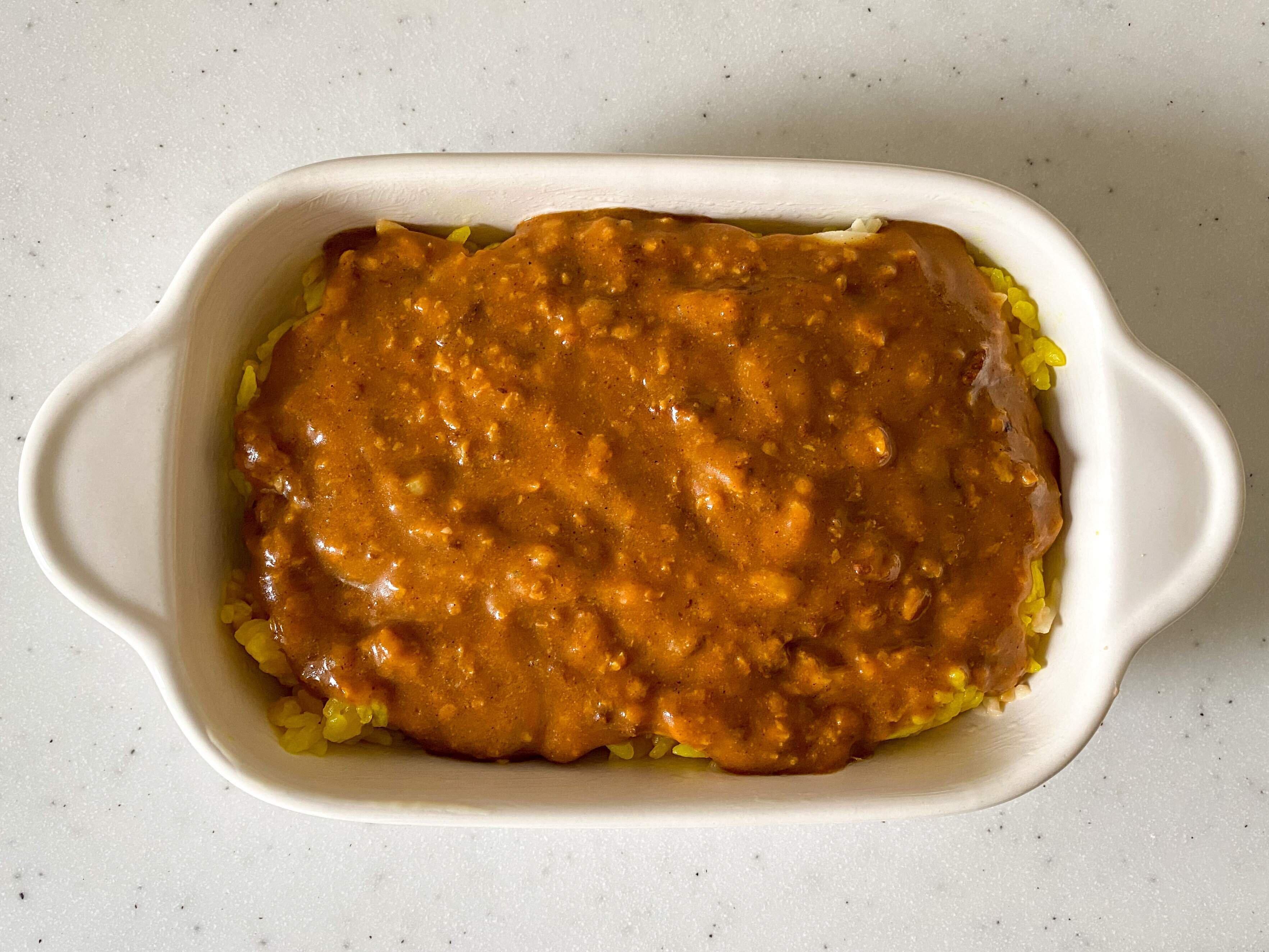 (4)レトルトカレーを上からかける。