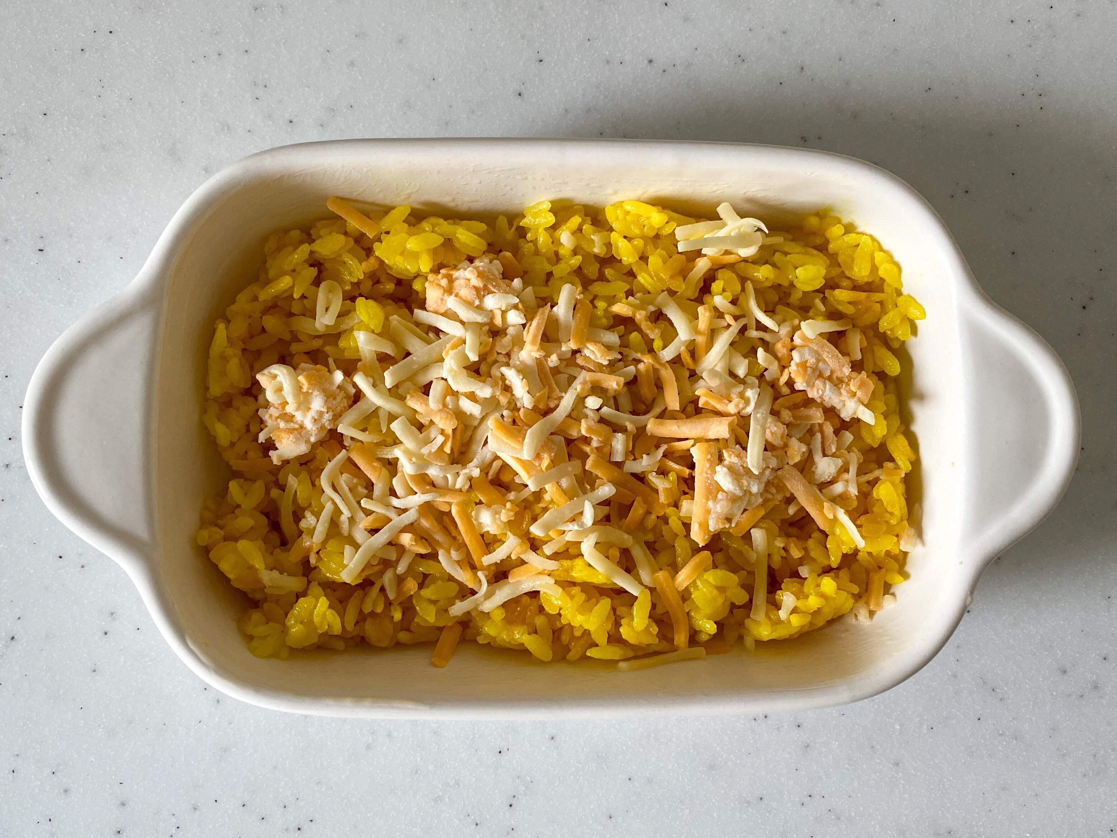 (3)バターを塗った器にごはんを広げいれる。その上にたっぷりめにシュレッドチーズをのせる。