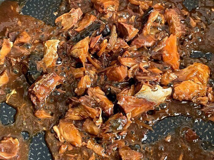 醤油も加え、サバを崩しながら汁気がとぶまで炒める。