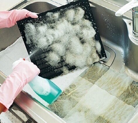 シンクに古タオルを広げ、はずした換気扇フィルターを置く。アルカリ性洗剤を吹きつけ、ペーパータオルを掛けて、汚れに"湿布"。