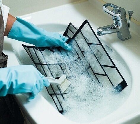 フィルターは、ほこりを掃除機で吸ってから、中性洗剤を溶かしたぬるま湯につけ置き。ツインブラシのソフト側で洗い流し、乾かす。