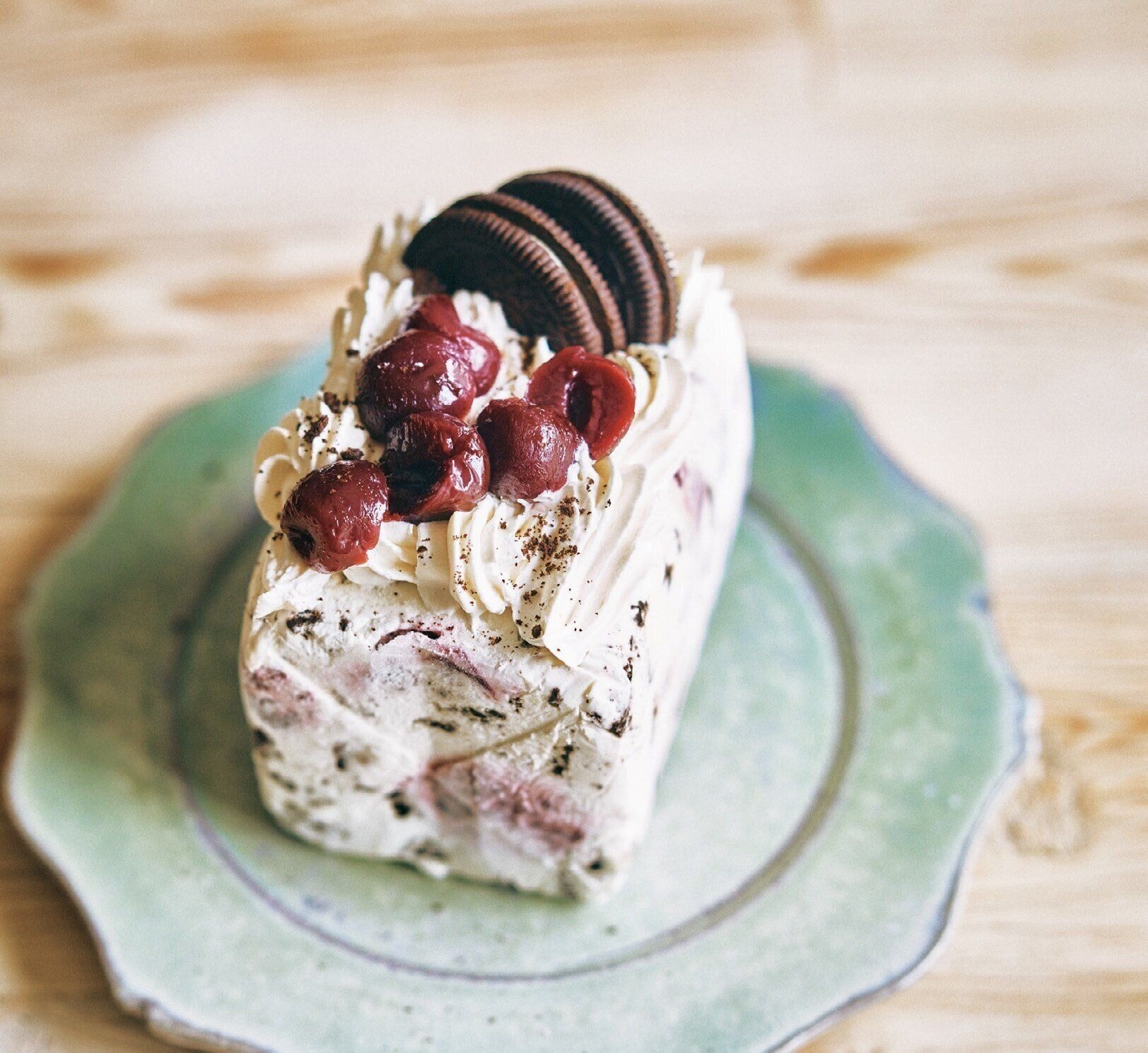 シャカシャカふった生クリームに、半分に切って汁けを拭いたダークチェリー(缶詰)と砕いたクリームサンドチョコレートクッキーを混ぜる。仕上げは、ホイップクリームを絞ってから、ダークチェリー適量、チョコレートクッキー1枚を半分に割ってのせ、砕いたクッキーをふる。