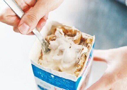 ふったときにポタッポタッと固まったような感じになったら口を開け、生クリームがもったりしていたら、[B]を入れてスプーンでよく混ぜる。パックの口の上を平らに締めてテープで留め、トントンと台に落として空気を抜く。冷凍室で3時間以上(できれば一晩)冷やし固める。