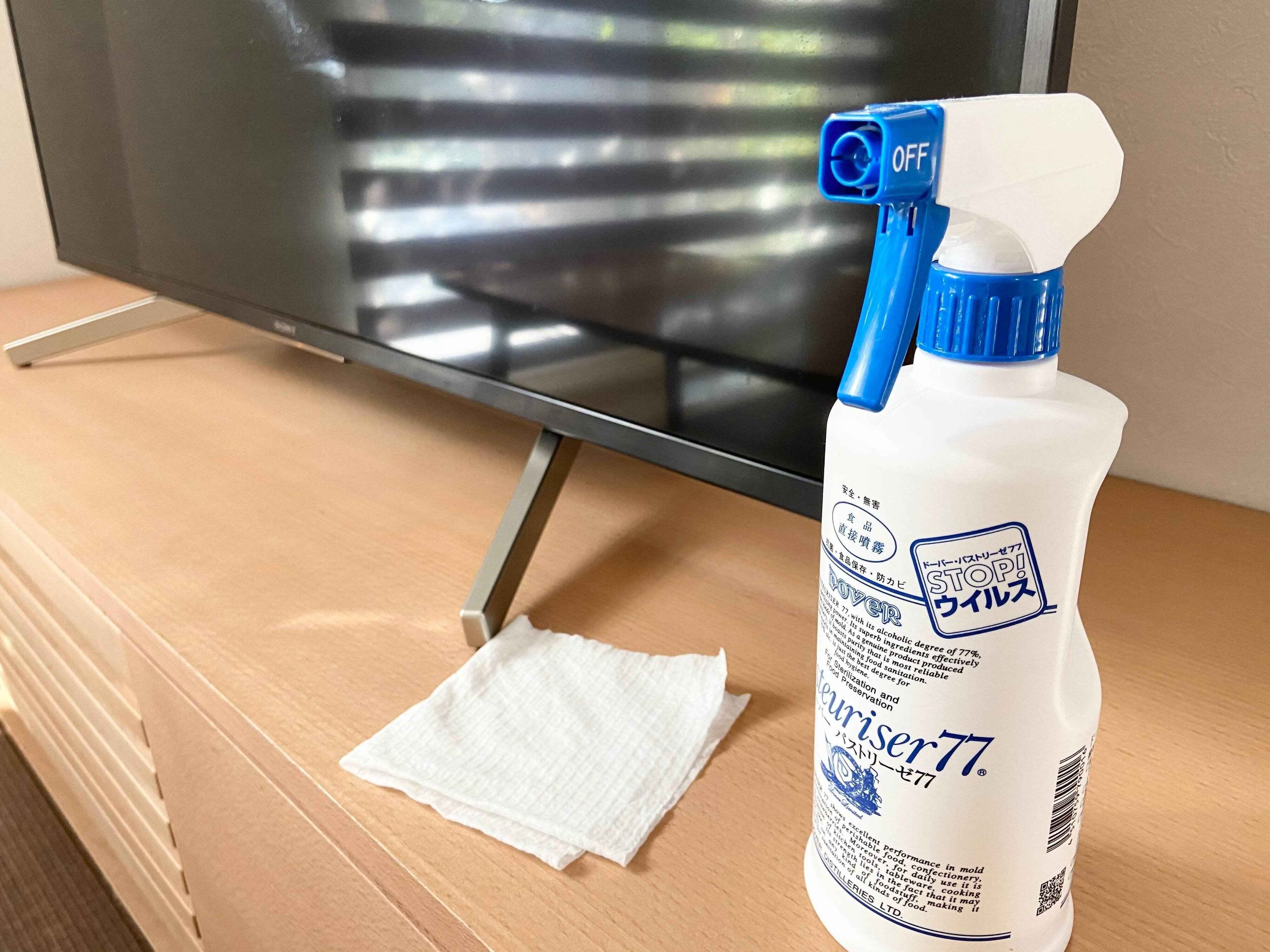 朝のキッチンリセットでテーブルを拭くついでに、ピアノの上だったり、TVボードの上もついでアルコールをつかって拭きます。