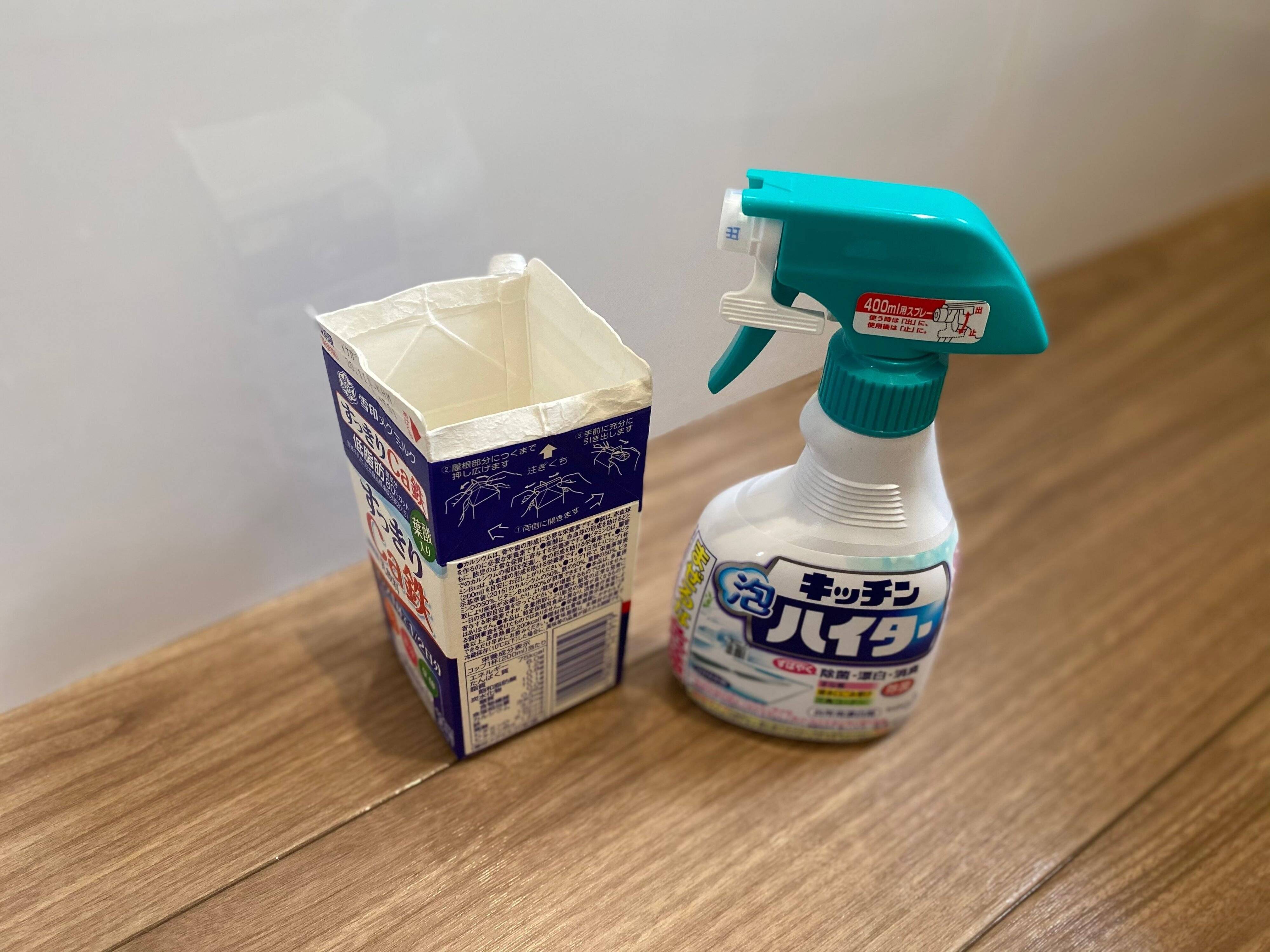 空になった牛乳パックに外したゴムの部分を入れ、塩素系漂白剤をスプレーして除菌します。