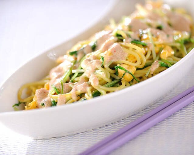 明太子やユズコショウの味わいがポイントのソースをかける、和風焼きそばのレシピ。和食のメインにおすすめです。ソースと中華麵、ふわふわの卵がからんで食が進みそうですね!