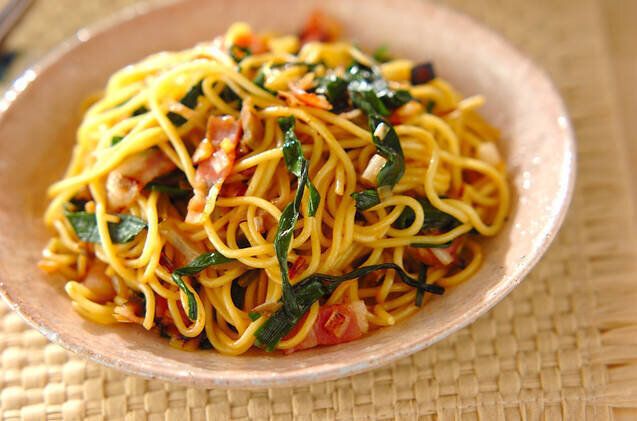 高菜を使った、あっさりとした旨味のある焼きそばです。ご家庭にある具材で簡単につくれるレシピです。卵をからめてから麺を焼くことでよくからみ、優しい味の焼きそばになっています。