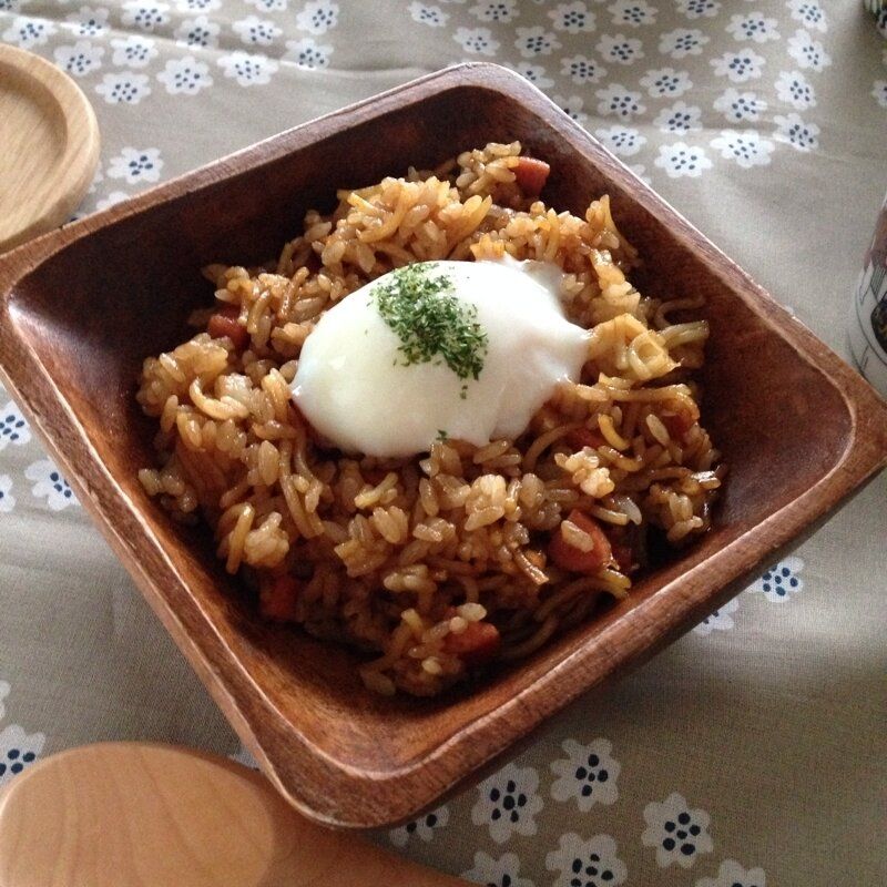 こまかく刻んだ焼きそばとご飯を炒め合わせた、簡単そば飯レシピです。温玉をトッピングすると、さらにおいしさと見栄えがアップします。好みで、刻んだネギを加えても◎。