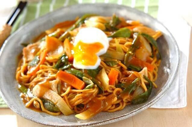 カレー粉やカレールウも使った、和食のメインにぴったりのカレー焼きそば。カレールウが余ったときや、新鮮な味わいを楽しみたいときにもおすすめです。とろ~りとした温泉卵との相性もよさそうですね!