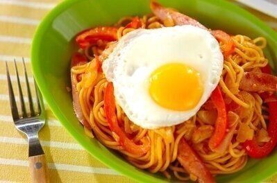 焼きそばの麺にケチャップ、ソースを加えれば、簡単にナポリタンをつくることができますよ。麺はゆでずに炒めるだけなので、パスタよりもつくるのがラクで簡単。調味料も少なく10分で完成するので、平日のランチにもぴったりです。