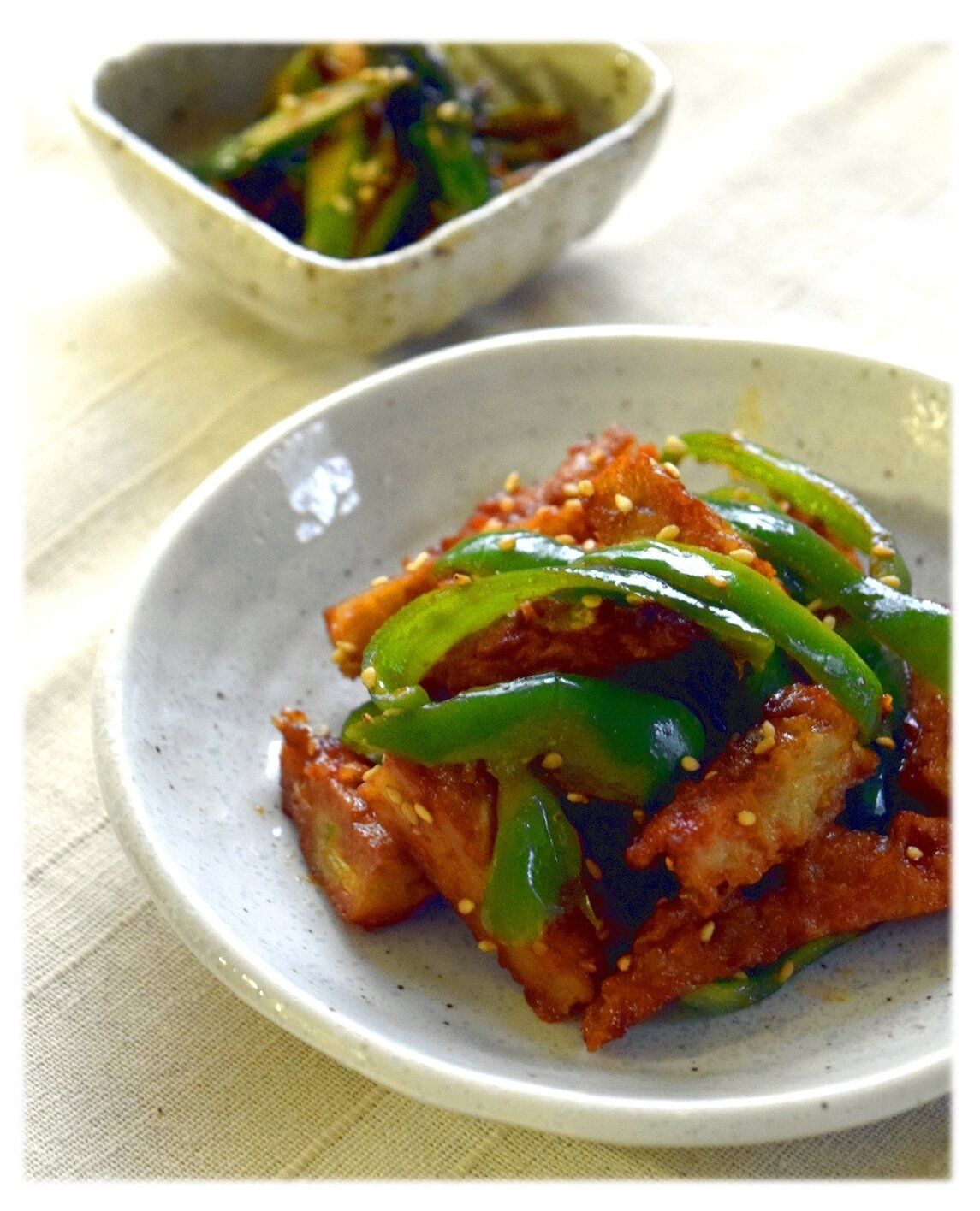 さつま揚げとピーマンに、コチュジャンを絡めた炒め物レシピ。ピリ辛風味で、お酒が進むおつまみです。調理時間10分ほどでできあがるので、いそがしい日のおかずにもおすすめ。