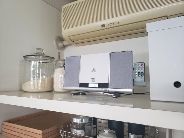 エプロンを着けたら、次は好きな音楽をかけます。