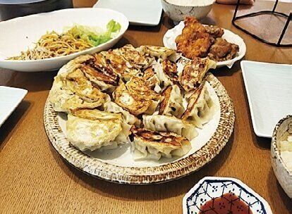 家族全員が好物の餃子は大量に作って、一部は冷凍。ランチで食べた総菜の残りのから揚げとパスタサラダ。