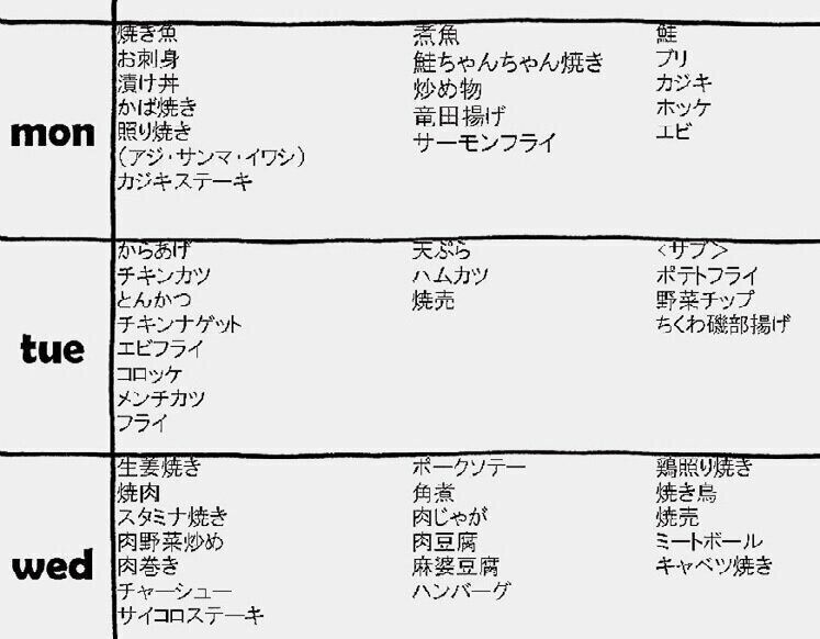 曜日別にメニューのジャンルを決めました。ジャンル内で考えればいいのでイチから考えるより断然ラク。月曜は前日に買った魚を鮮度のいいうちに食べる、火曜はまだ気力があるから揚げもの……理由も明確で合理的!