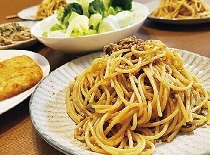 ねぎとひき肉のピリ辛パスタは初トライのメニュー。メインを頑張ったので、冷凍のハッシュドポテトとサラダでかんたんに。