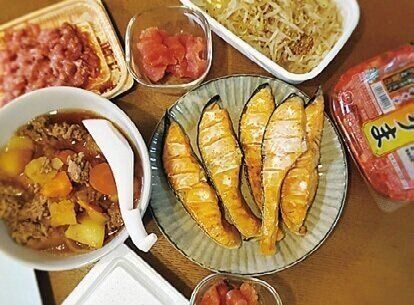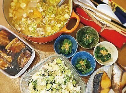 焼き鮭と肉じゃががメイン。レンチンするだけのナムル、出すだけのねぎとろ、キムチなどで品数を増やします。