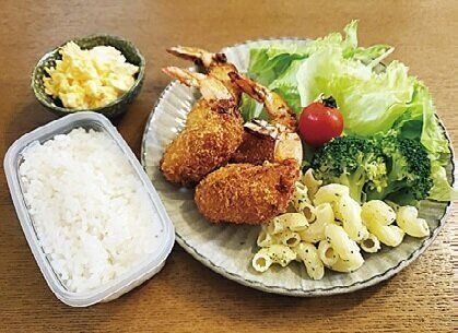 メインは鶏もも肉1kg分のから揚げ。小あじの南蛮漬けはおとといの残り物。出すだけのたらこと納豆を添えて。