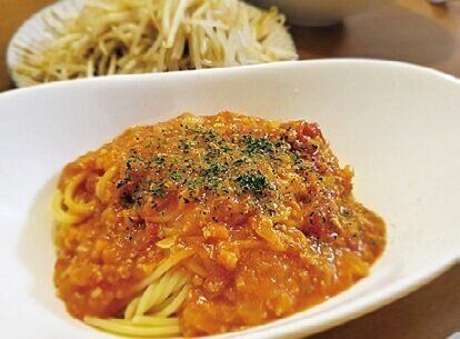 残り物の野菜を投入した自家製ミートソースでパスタを。木曜日は疲れがピークなので、あとはもやし炒めでよし。