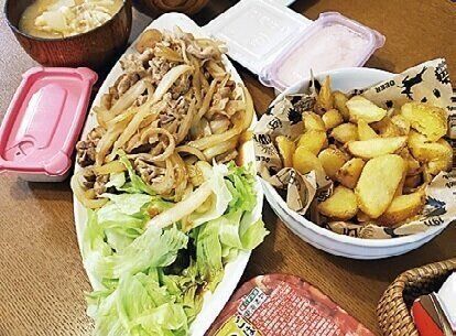 豚こまと玉ねぎをにんにく風味に炒めるスタミナ焼きは夫の得意料理。フライドポテトをプラスすれば満腹♪
