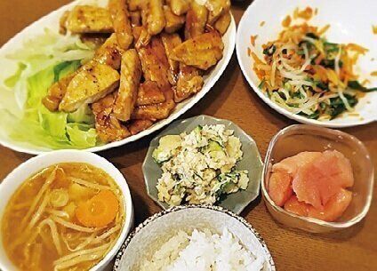 メインは豚ロース肉のガーリックバター焼き。残り物のもやしでナムルとスープを。残った予算でたらこを買いました。