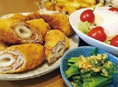 ちくわは肉を巻いてボリュームUP。常備菜の鶏ハムのサラダ、ほうれん草のおひたし、業スーのポテトフライで副菜3品。