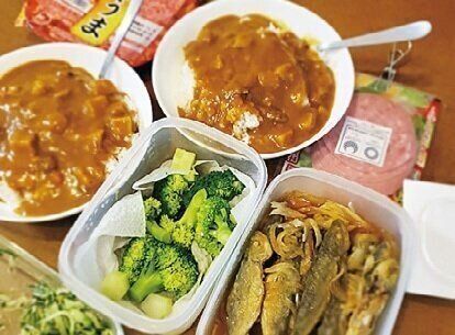 疲れがピークの日はレトルトカレーに。常備菜のゆでブロッコリー、小あじの南蛮漬け、きゅうりのごま酢あえをプラス。