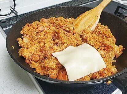 夫が会社の食事会だったのでかんたんに。チキンライスにスライスチーズをのせて、フライパンごと食卓にドーン。