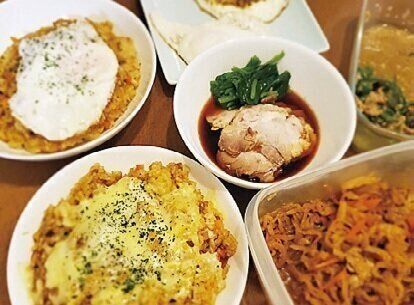 カレーピラフにチーズや目玉焼きをのせて見た目UP。あとはチャーシュウの残り、切り干し大根などある物で。