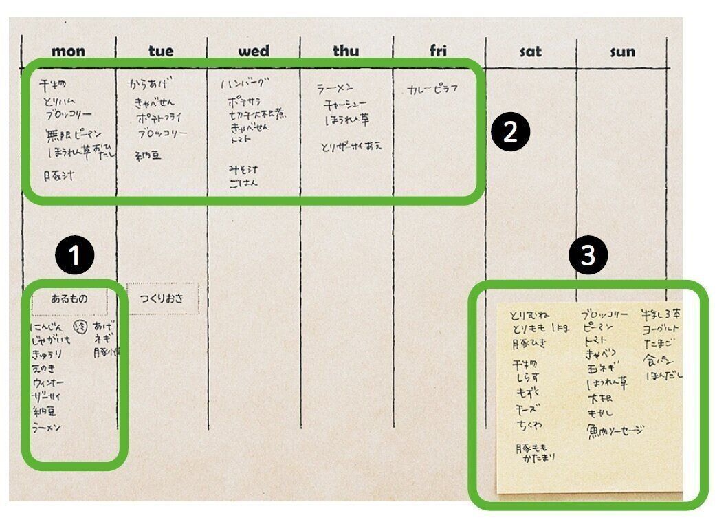まず、家にある食材を書き出し、それを使う料理をリストからピックアップ。あとはたりない食材をメモして買い物へ。食品ロスがなく、使う物しか買わないからムダなし!