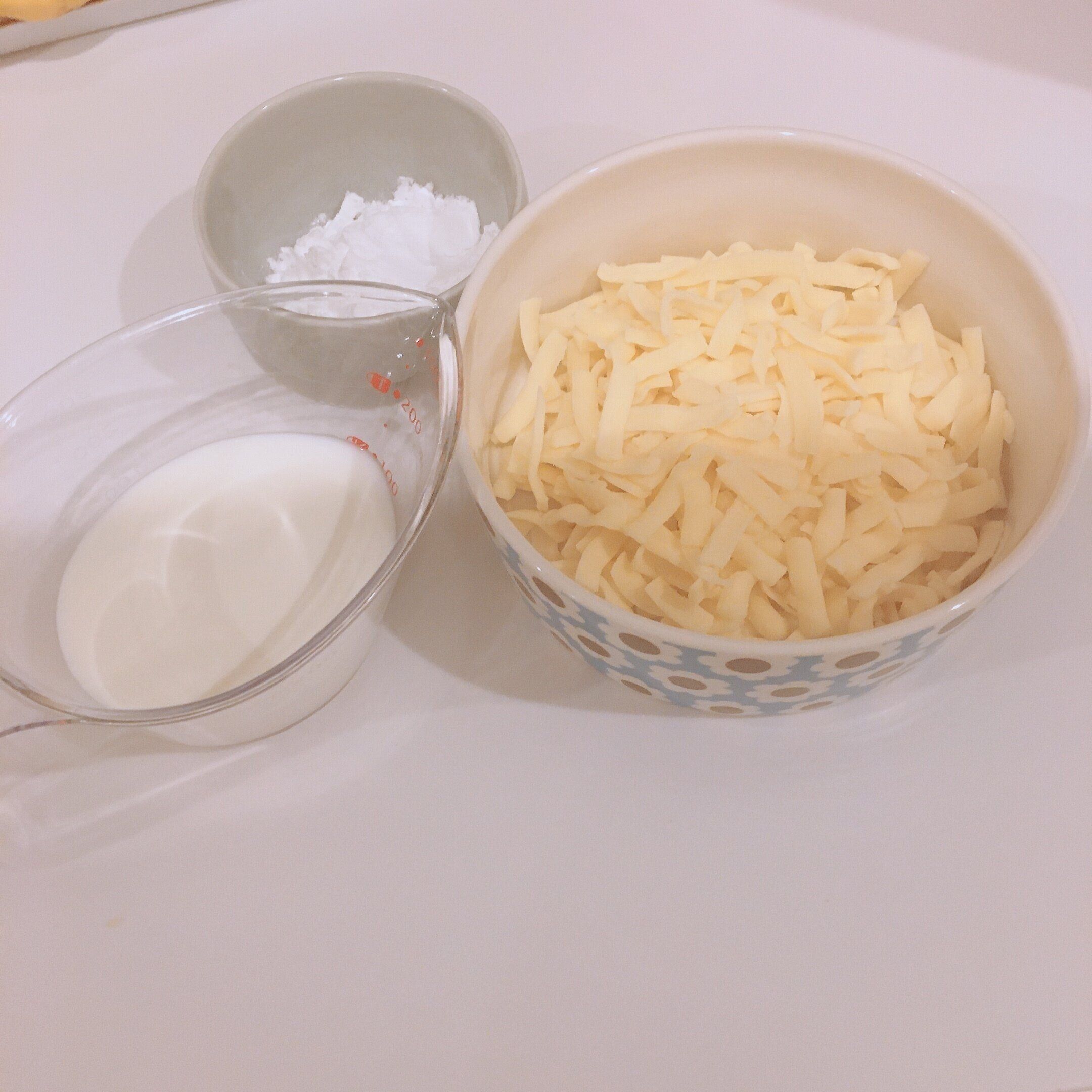 (2)チーズに片栗粉をまぶし、まんべんなく混ぜる