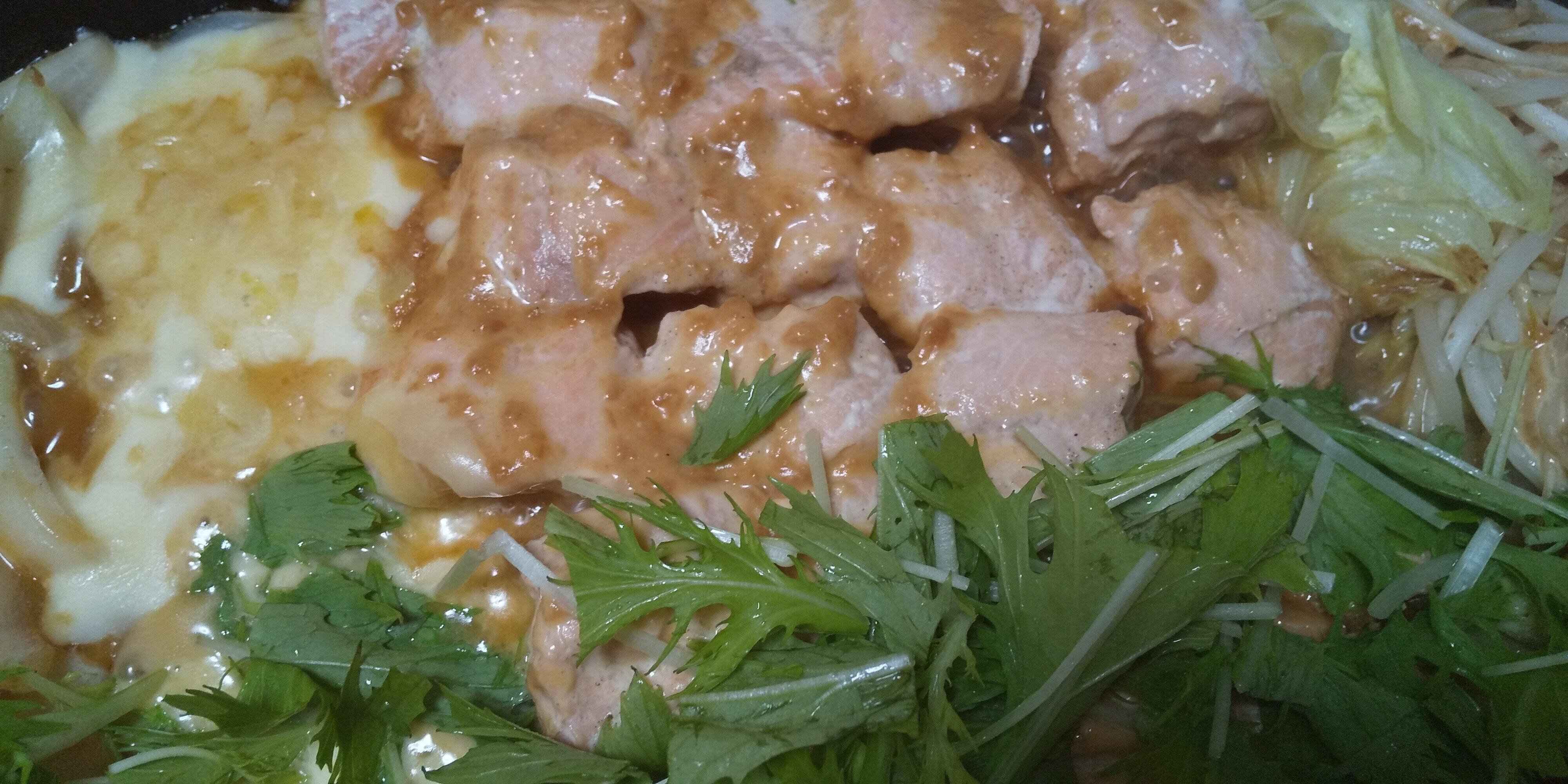 野菜がしんなりして鮭が白っぽくなったら、合わせダレを鮭の周りにかけます。