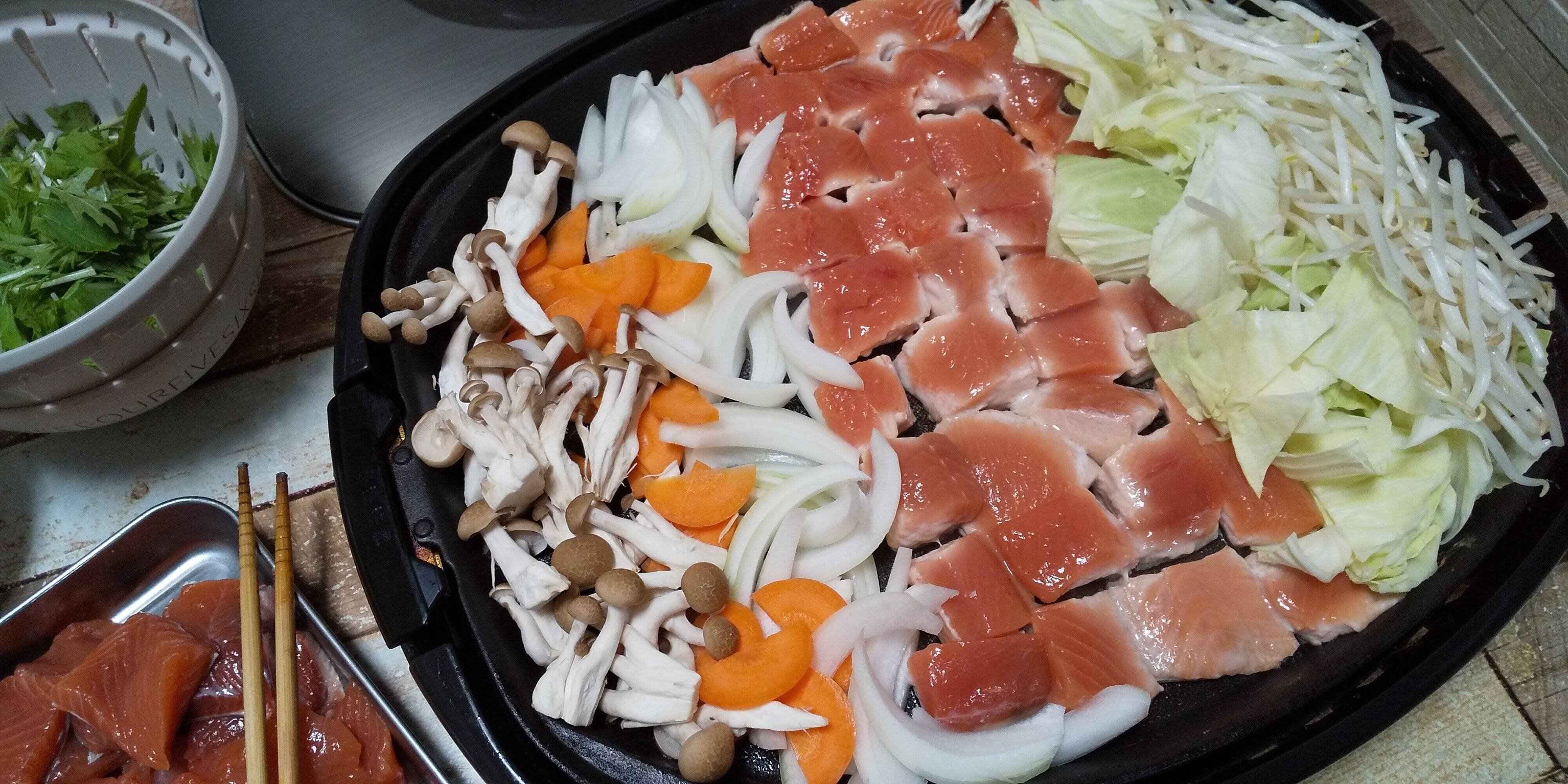 200度くらいに熱したホットプレートに、サラダ油をしいて、写真のように鮭と野菜を並べていきます。