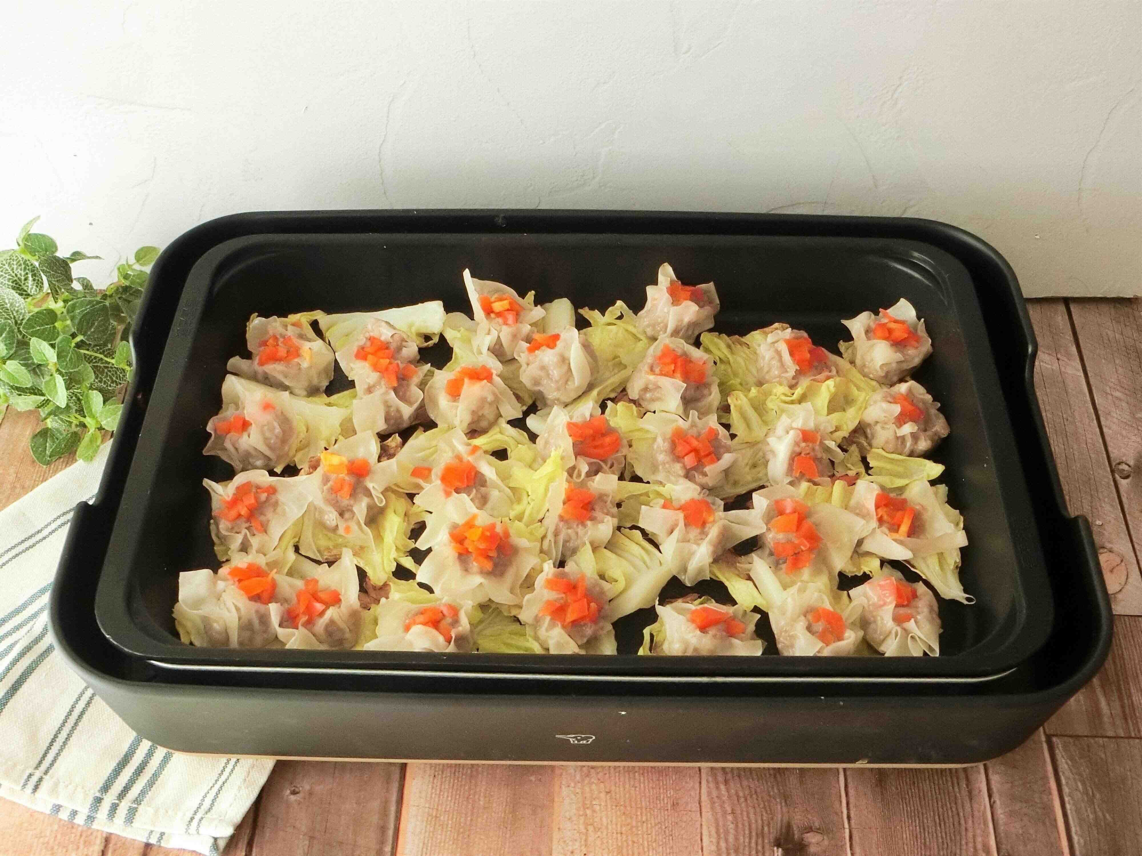 4.キャベツをホットプレートに敷き、焼売を並べます。パプリカを乗せたら水を入れ、蓋をして7~10分蒸し焼きにして完成。