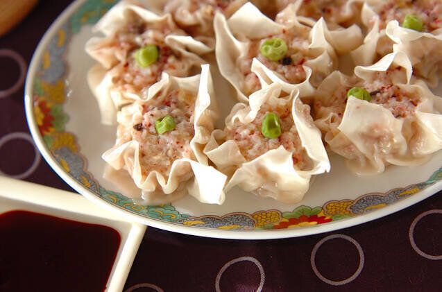 イカや明太子の旨味を堪能できそうな、手軽につくれるシューマイのレシピ。中華のメインにぴったりで、おつまみにもよさそうです。レモン汁をつけてさっぱりといただきます。