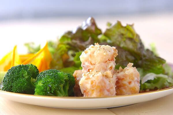 冷凍シュウマイを使ってつくる、揚げシューマイのマヨソースのレシピ。サクッと揚げたシュウマイと、コクのあるマヨソースの組み合わせを楽しめそうです。野菜といっしょに彩りよく盛りつければ、食卓も華やかになりそうですね。