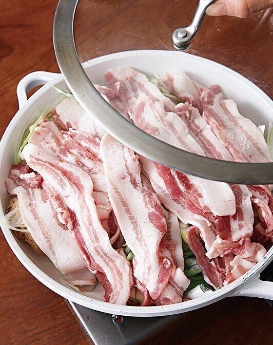 (2)豚肉をのせ、蒸し煮にする