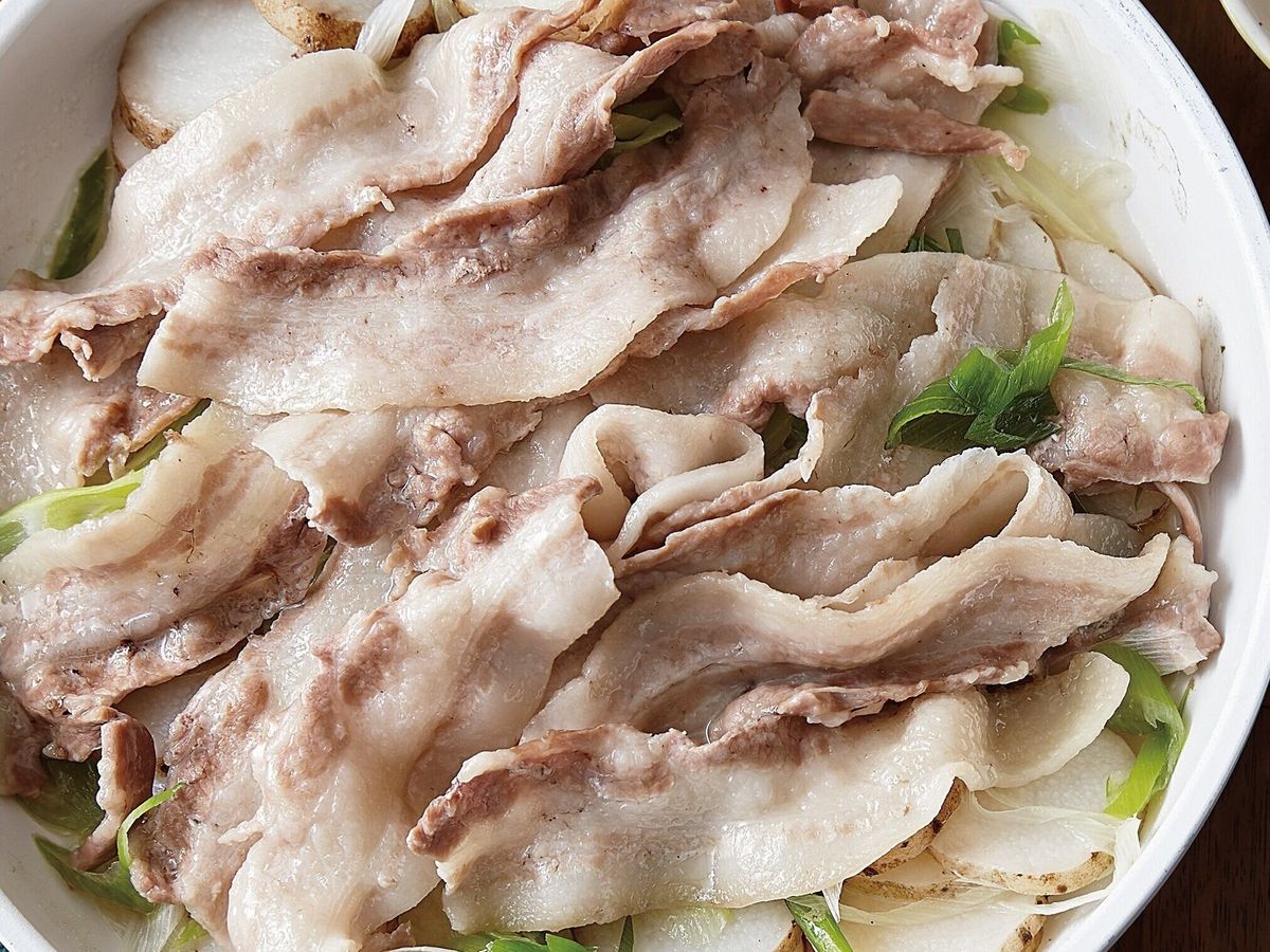 (1)の上に豚肉を広げてのせ、[A]をふり、ふたをして中火にかける。約3分煮たら弱火にし、8分蒸し煮にする。