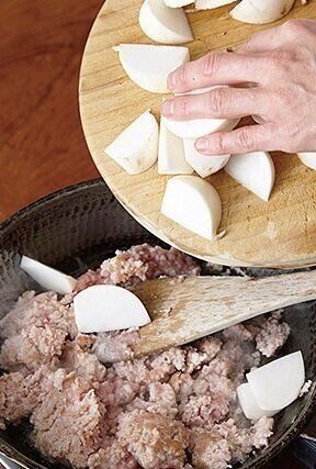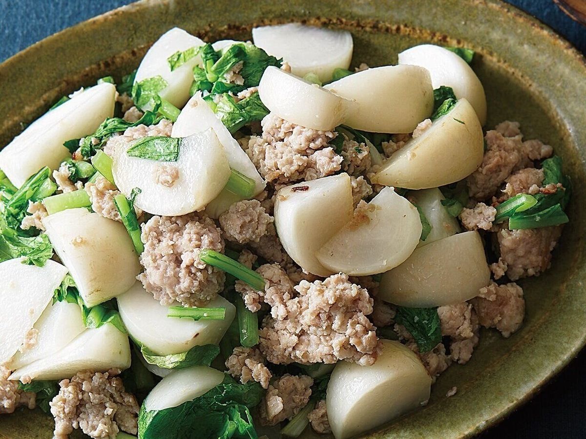 『サンキュ!』2021年1月号の「疲れた日の15分おかず」よりひき肉とかぶの塩炒めをご紹介します。