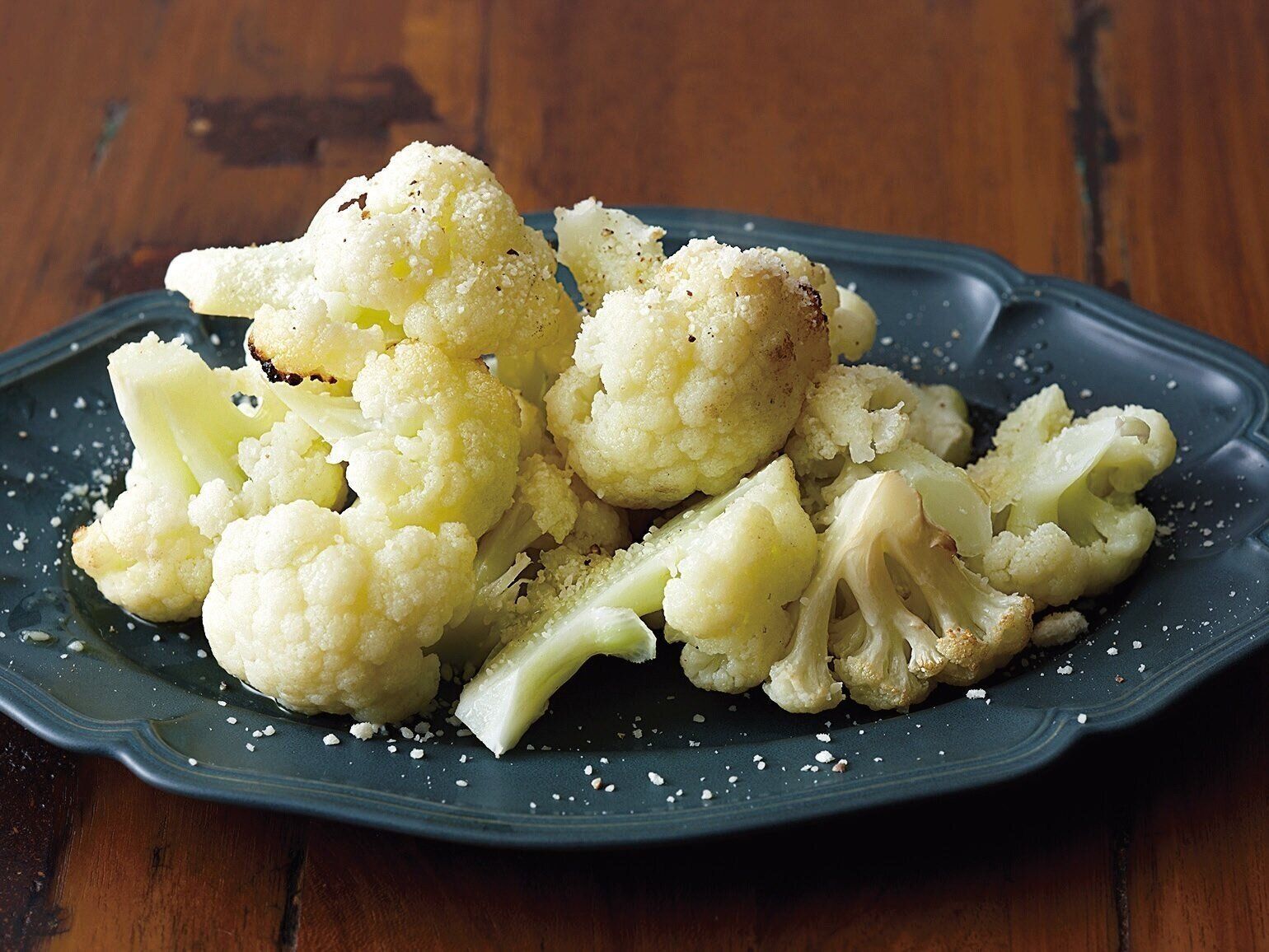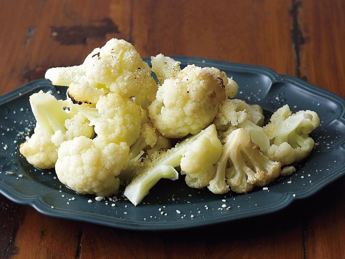 カリフラワーは小房に分け、アルミホイルに広げてのせ、白ワインとオリーブ油をふって包む。魚焼きグリル(またはオーブントースター)で8分焼き、アルミホイルを開いてさらに3分焼き、粉チーズをふる。
