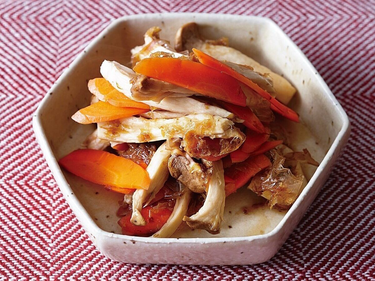 にんじんは縦に2等分し、斜めに薄切りにする。エリンギは縦に6等分に手で裂く。耐熱皿に、にんじんとエリンギを入れてラップをふんわりと掛け、電子レンジで約3分加熱する。軽く水けをきり、ポン酢しょうゆを加えてなじませ、削り節をふる。